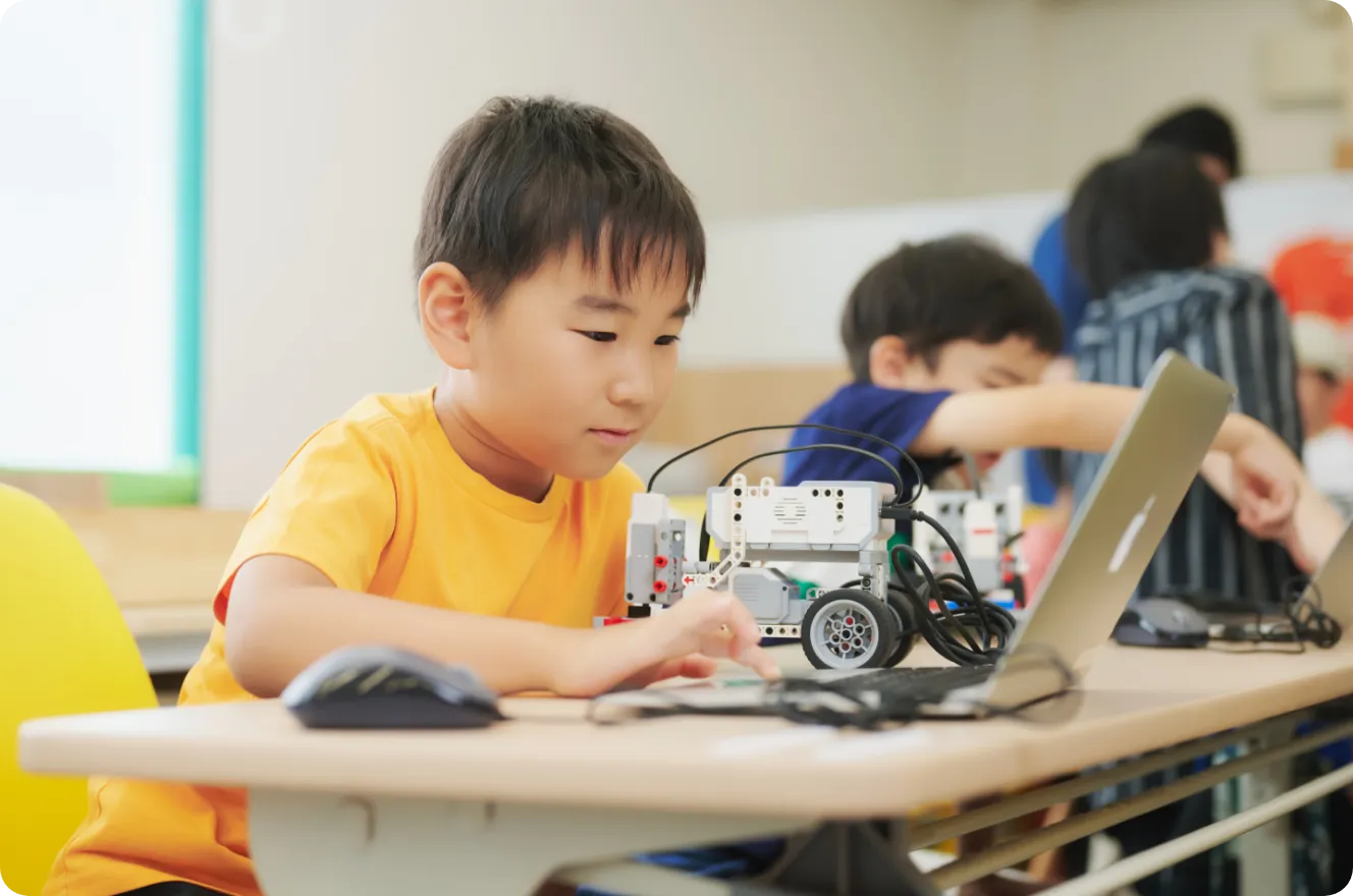 プログラボの教室を学校内で放課後の習い事として実施する「校内教室」もあります。また企業様にはロボットプログラミング教材を活用した研修を行っています。
